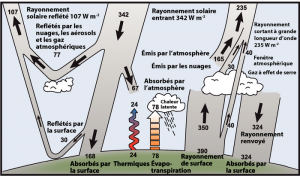 1) Le rayonnement en provenance du soleil, évalué au sol à 168 W/m², après la division par 4 qui est faite de la constante solaire, après déduction de l’albédo (107 sur le schéma) et après déduction de l’énergie absorbée par l’atmosphère (67 sur le schéma).